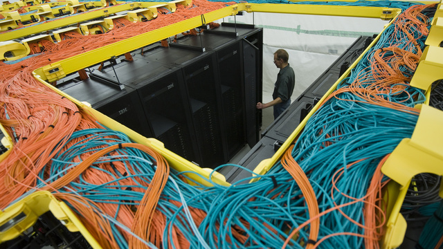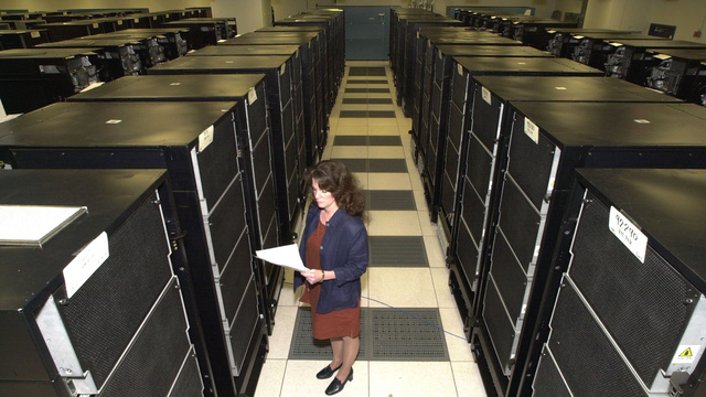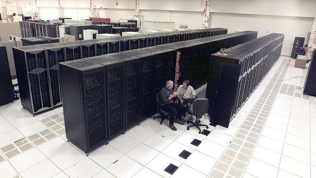 Η αμυντική λειτουργία των κρατών χρησιμοποιεί supercomputers από τις πρώτες ημέρες. Εδώ, το 2000, μια τεχνικός επιθεωρεί τη λειτουργία του ASCI White computer, που χρησιμοποιούταν από την Υπηρεσία Ενέργειας των ΗΠΑ για να προσομοιώνει δοκιμασίες πυρηνικών όπλων. Το γρηγορότερο supercomputer της εποχής, το σύστημα RS/6000 SP ήταν ικανό να διεκπεραιώνει 12 τρισεκατομμύρια υπολογισμούς το δευτερόλεπτο, είχε βάρος 96.636 κιλών και απαιτούσε ενέργεια 1,2 ΜegaWatts!