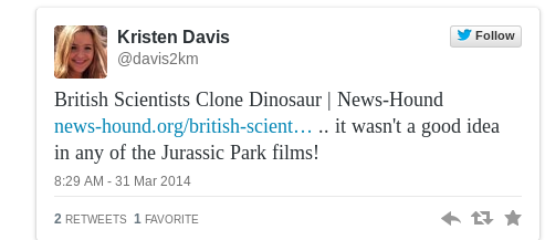 "Στην επιστημονική κοινότητα, λένε ότι η κλωνοποίηση των δεινοσαύρων -η πρώτη του είδους της- αποτελεί ορόσημο για τη γενετική μηχανική" αναφέρει το άρθρο που δημοσιεύτηκε στο hound.org, ένα site που έχει επανειλημμένως ξεγελάσει το Διαδίκτυο, με πιο πρόσφατη περίπτωση αυτή μιας Βρετανής ναυαγού, για την οποία ο εν λόγω δικτυακός τόπος έγραψε ότι σώθηκε μέσω της υπηρεσίας Google Earth.