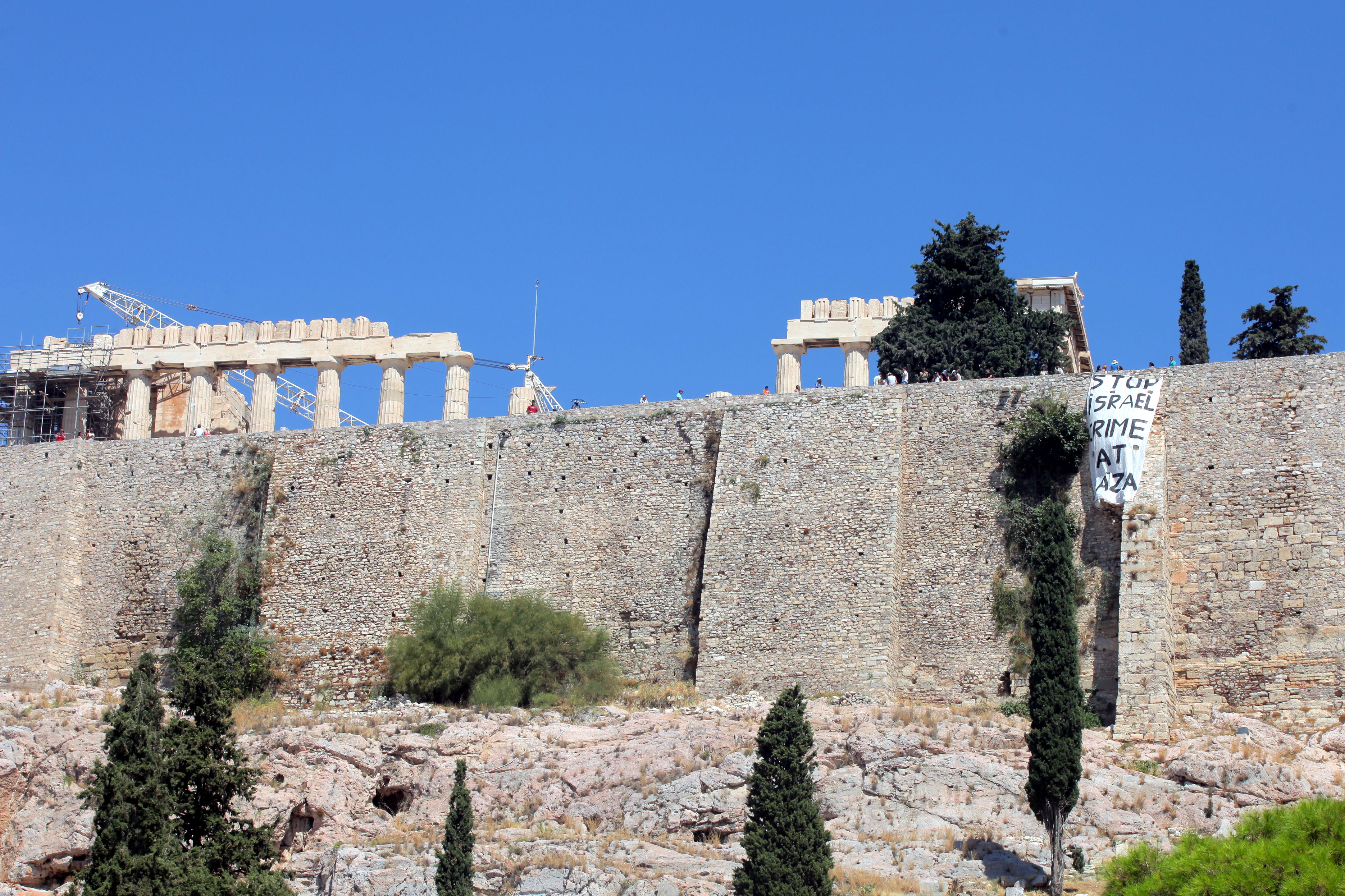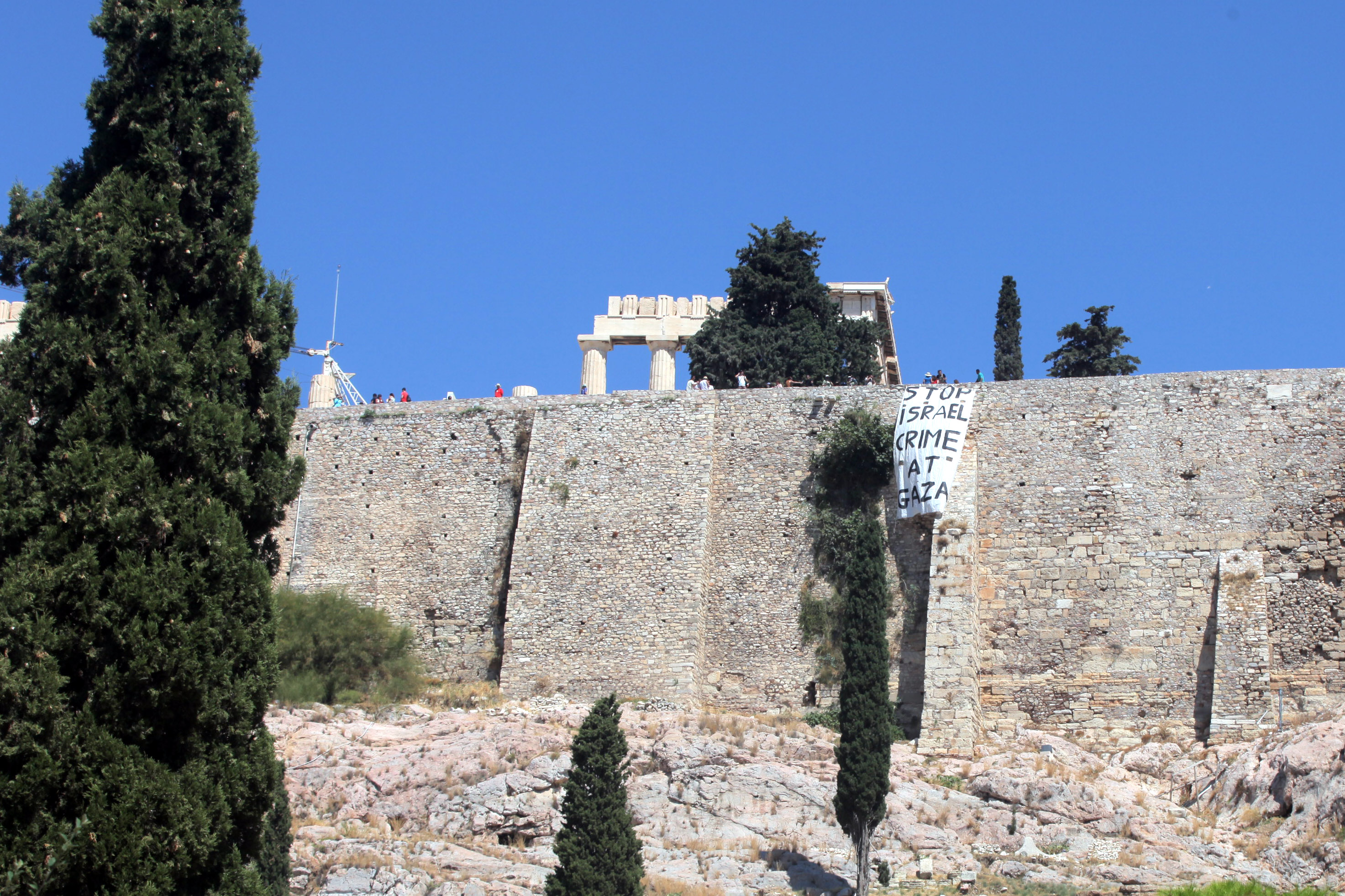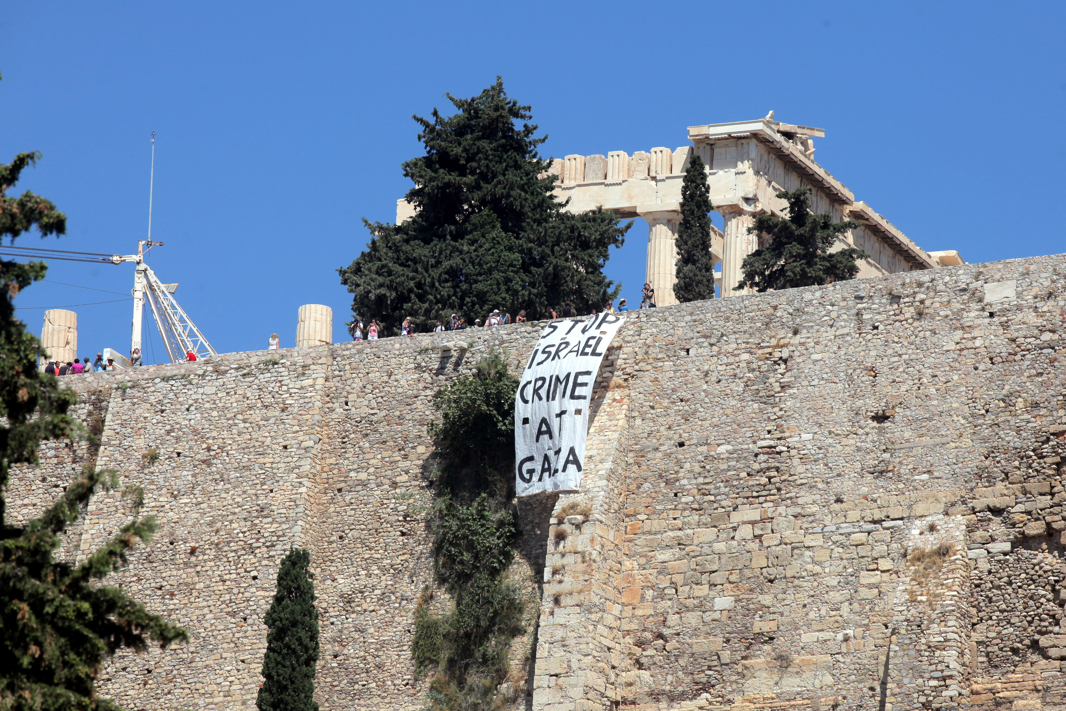 Τεταμένο ήταν το κλίμα το πρωί της Τρίτης στον Ιερό Βράχο της Ακρόπολης, σημειώθηκε ένταση μεταξύ ακτιβιστών που διαμαρτύρονταν για τον πόλεμο στη Λωρίδα της Γάζας και ξεναγών.
